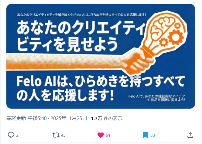 - Felo公式ホームページに作品掲載(あなたのXリンク付き)
